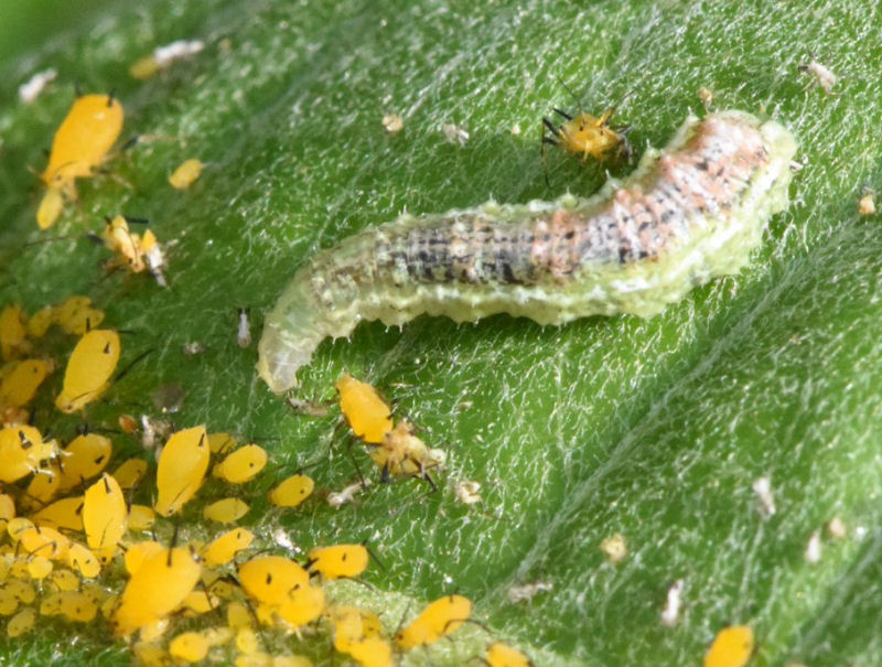 Being able to identify the syrphid fly larvae is crucial as you make decisions about pest management in your garden. Luckily, there are a few simple features that will allow you to distinguish between syrphid fly larvae and caterpillars. The first thing to look for is whether or not the insect has legs. Syrphid fly larvae do not have legs and move in an undulating manner. Caterpillars have legs. If you are unsure if an insect has legs, try getting it to move. The legs will be apparent on a moving caterpillar. Syrphid fly larvae have nondescript heads, no eyes, and no chewing mouthparts. Impressively, these blind legless larvae manage to consume entire aphid colonies!